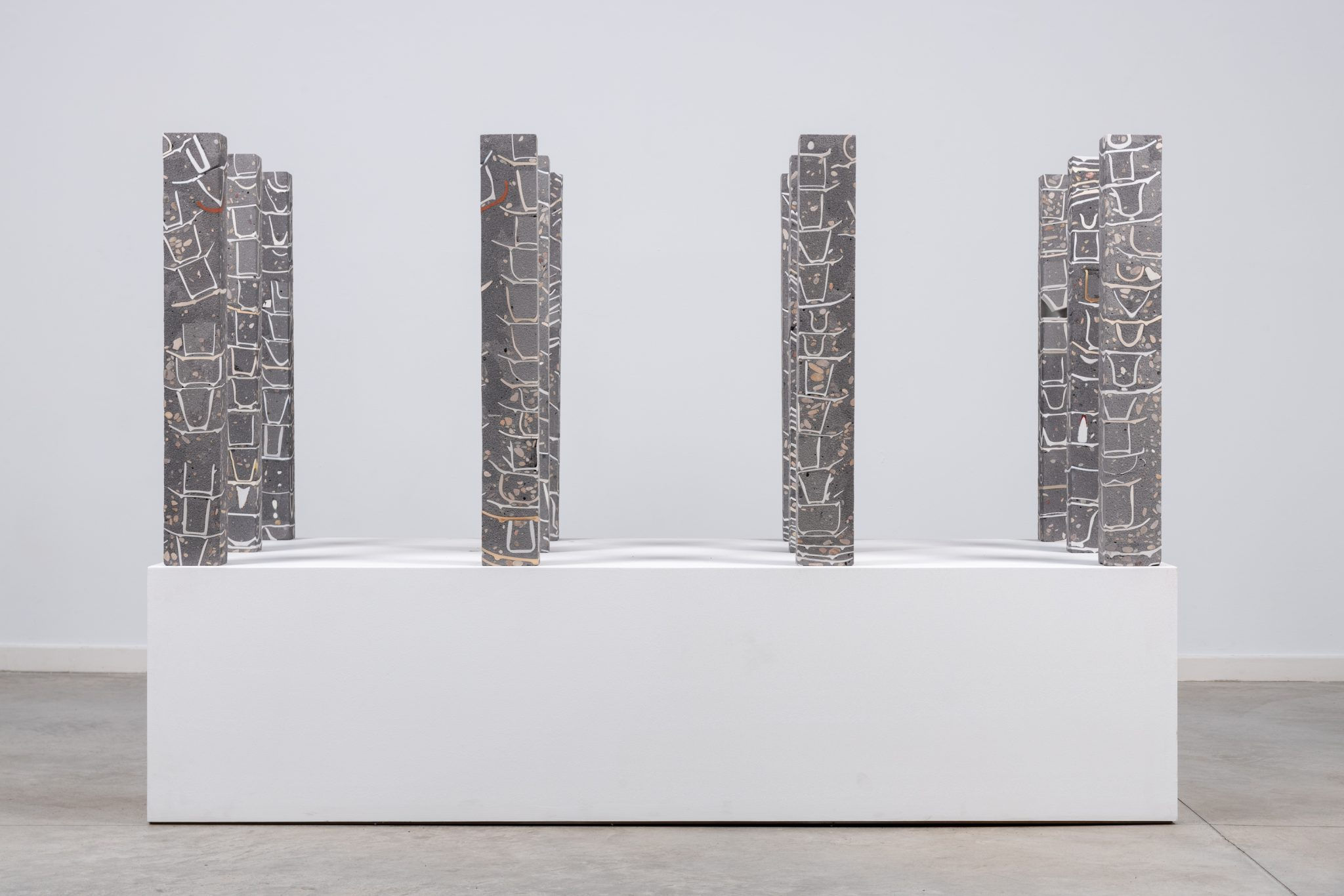Twelve towers of stacked cups, cast in cement and presented like geotechnical core samples, with something archaeological about them—like a spine, like the discovery of fossil remains.